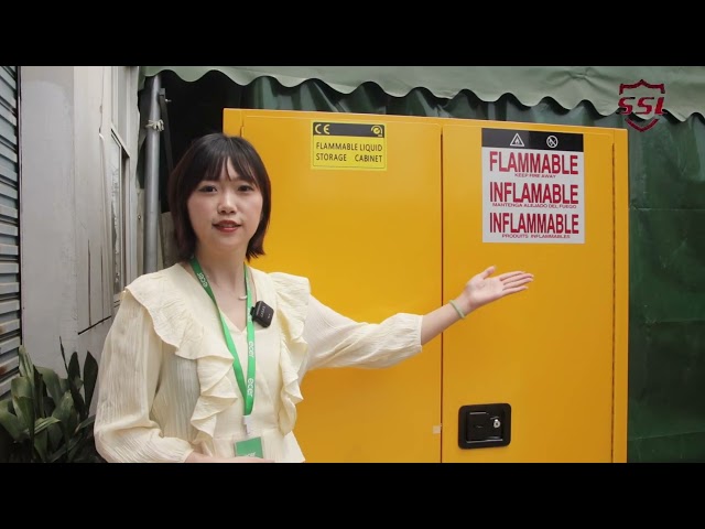 Szafa na materiały łatwopalne/palne (żółta): Ta szafa jest wyposażona w funkcje ognioodporne, aby zapewnić bezpieczne przechowywanie materiałów łatwopalnych. Zawiera wyraźne etykiety zarówno w języku angielskim, jak i mandaryńskim dla środowisk wielojęzycznych.